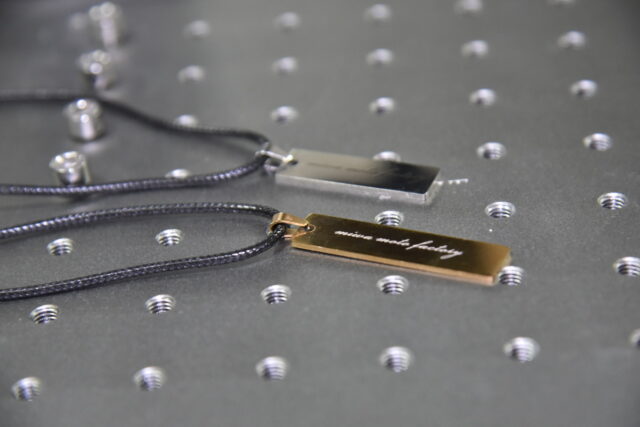 レーザーマーキングは、レーザー光を使って素材の表面に文字や図柄、ロゴ、バーコードなどを刻印することができます。切断するレーザーカットとは異なり、マーキングでは素材を削ったり切断せず、表面に変化を与えて視覚的なマークを残します。